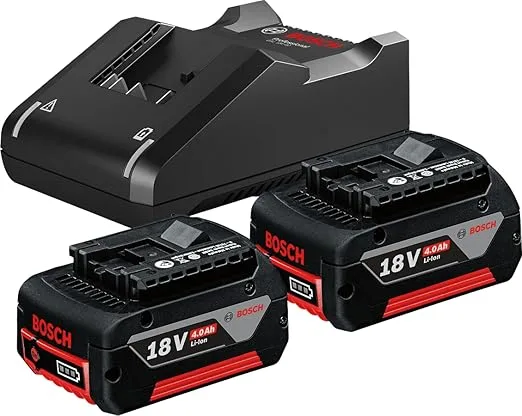 Bosch 18V Starter Kit with two 2.0Ah Li-Ion batteries and a high-speed wall-mountable charger. Featuring COOLPACK 2.0 technology for up to 100% longer battery life, this set is ideal for professionals using Bosch 18V tools. Charges to 80% in just 24 minutes.