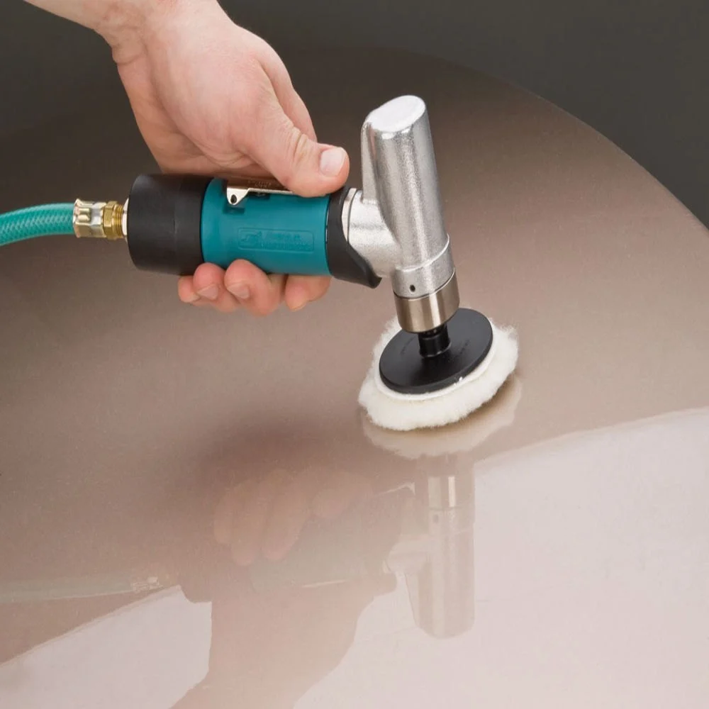 The 3″ (75 mm) Diameter 7 Degree Offset Rotary Buffer is a compact, high-performance air tool designed for precision buffing and polishing in tight or contoured areas. With a powerful 0.4 hp planetary-geared motor and a rear exhaust system, it operates at up to 5,000 RPM, delivering smooth, consistent rotary action for professional-grade results. The ergonomic 7-degree offset handle enhances control and comfort during extended use.